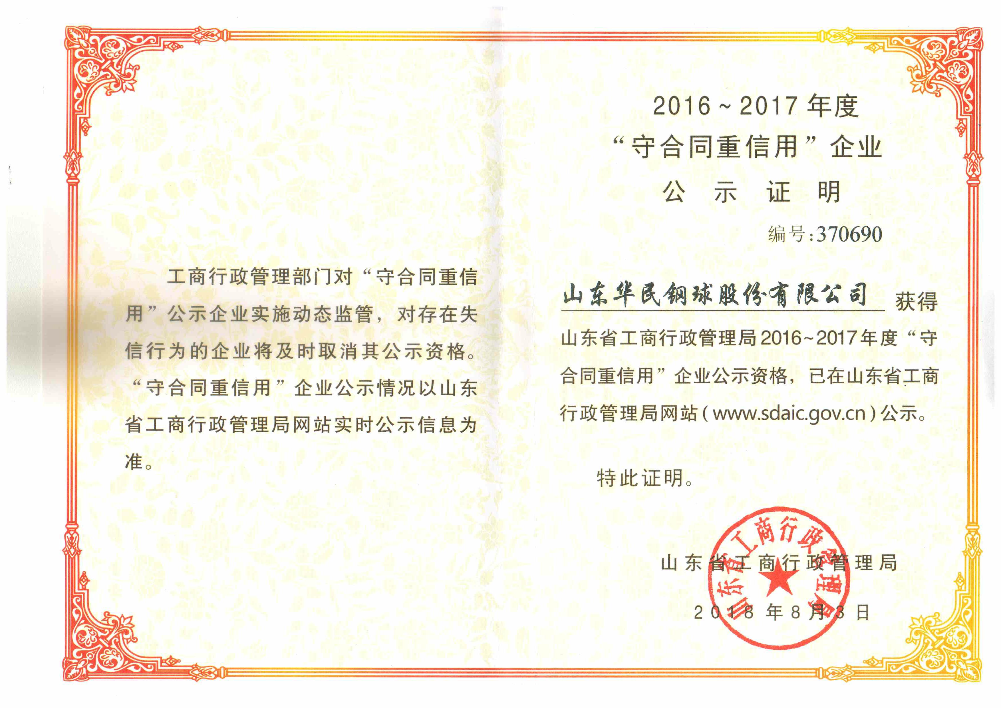 山東省守合同重信用證書