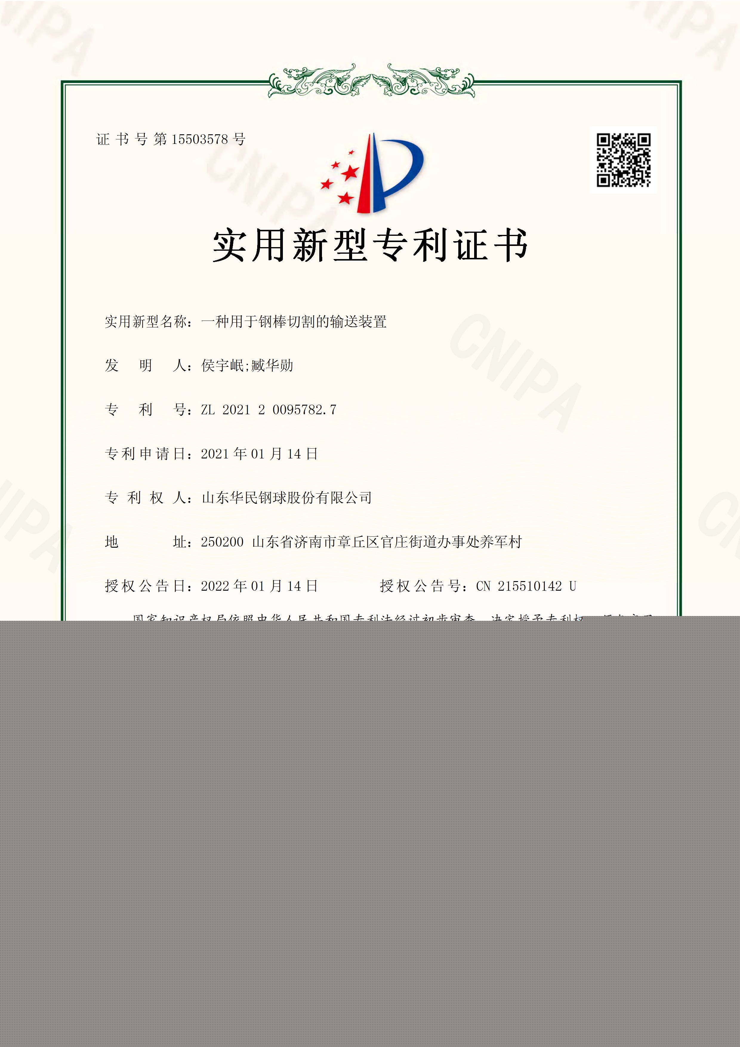 一種用于鋼棒切割的輸送裝置實(shí)用新型專利證書
